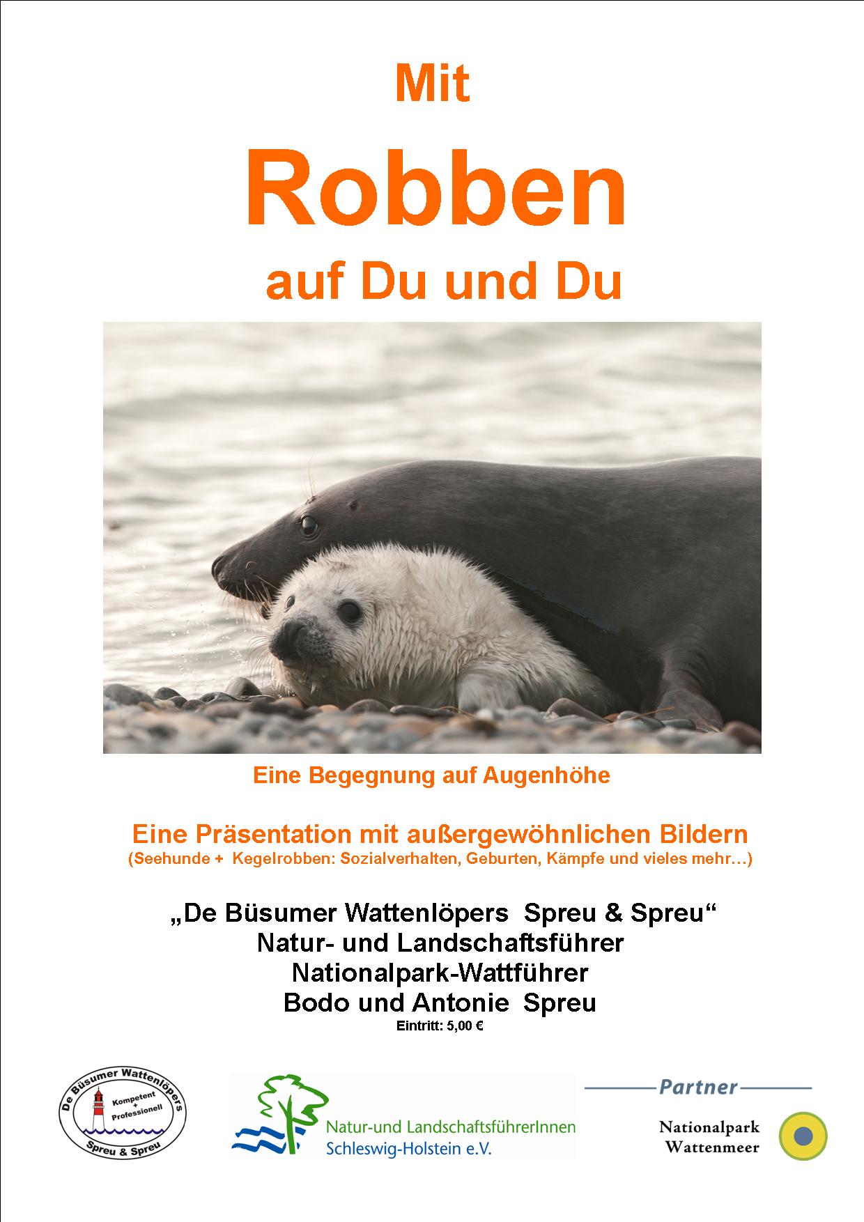 De Büsumer Wattenlöpers Spreu & Spreu möchten mit ihrem interessanten Vortrag die beiden heimischen Robben vorstellen. Es gibt vieles zu erfahren und vor allem auch in Bildern zu sehen. So z. B. die possierlichen Heuler, von Revierkämpfen gezeichnete Bullen und nicht zu letzt auch die Geburten und vieles mehr.
