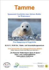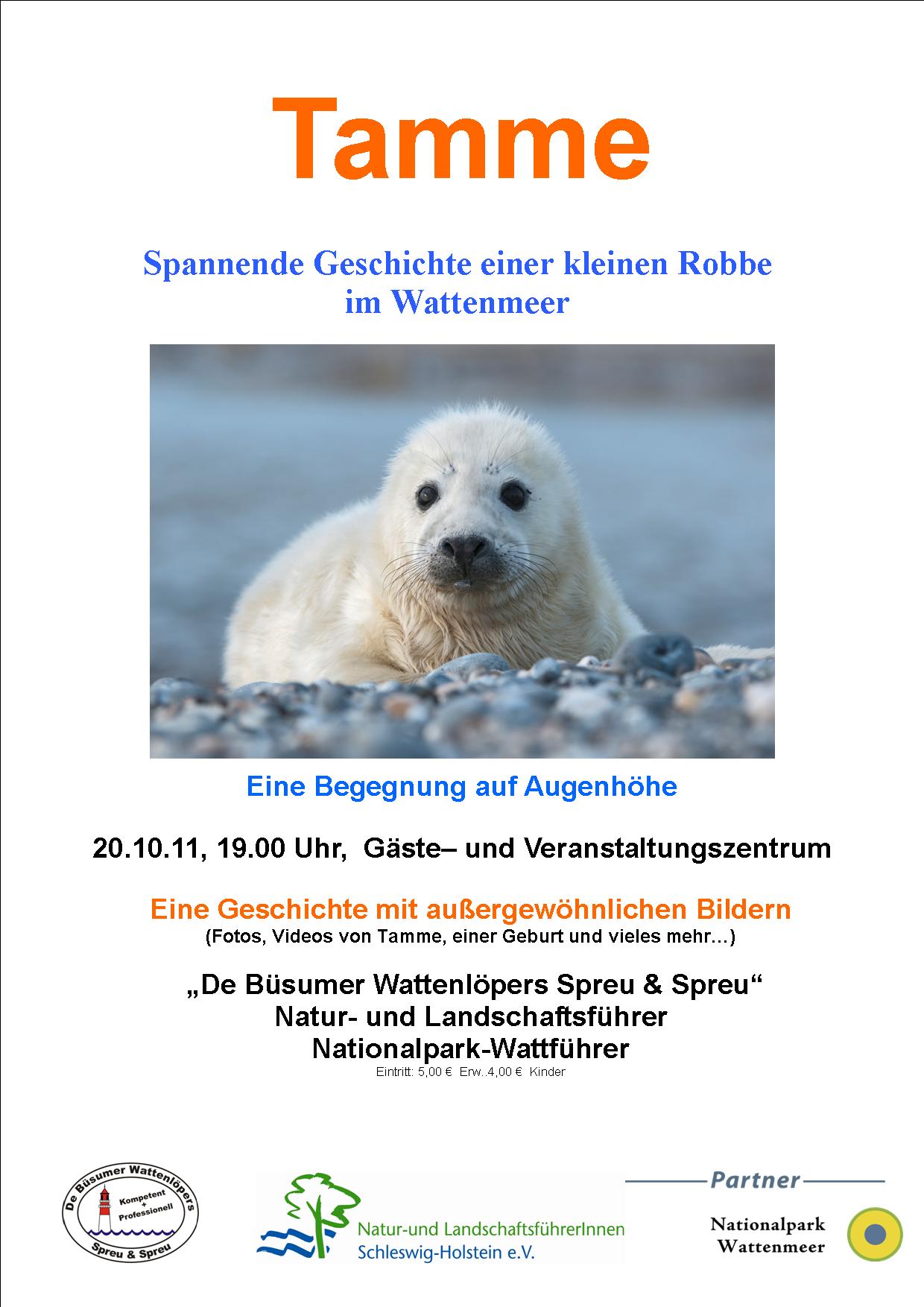 Dieser Vortrag ist ganz speziell für Kinder und ihre Eltern gedacht. Tamme ist die spannende Geschichte einer kleinen Robbe im Wattenmeer, wie sie geboren wird und vieles mehr was sie so in ihren ersten Tagen alles in ihrer neuen Umwelt des Wattenmeeres alles erlebt.